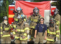 Girls Rule! Brooke Place residents are all dressed up with no place to go. Firefighter Amy Burdick of the Oakland Volunteer Fire Station hangs out with the girls after showing them how to get into fire fighting gear. |